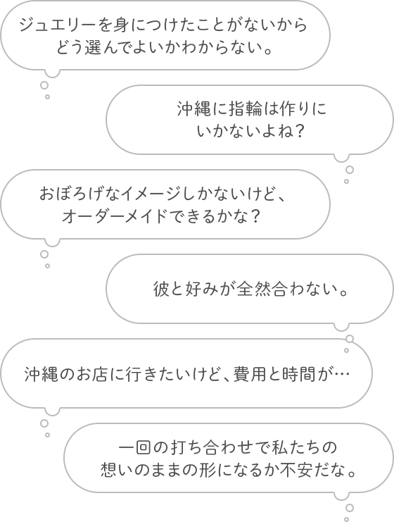 沖縄のJewelry Salon Planetでは、デザイナー兼職人がお二人の言葉や想いを伺いイメージをご提案いたします。細かなご説明を行いますので、オーダーメイドに不安のある方も安心してご利用ください。沖縄に来れなくても、電話などを通してオーダーすることも可能です。実績3,000組以上、ペアデザインはもちろん、ペアにこだわらない結婚指輪のデザインも承っております。二人の想いが詰まった世界にたった一つの結婚指輪のオーダーメイドなら、Jewelry Salon Planet。