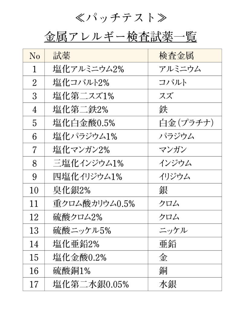 金属アレルギーというのは、どの金属にアレルギー反応が出るかということで、