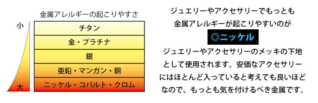 ジュエリーやアクセサリーに使われる金属で、金属アレルギーの原因金属の多くは