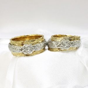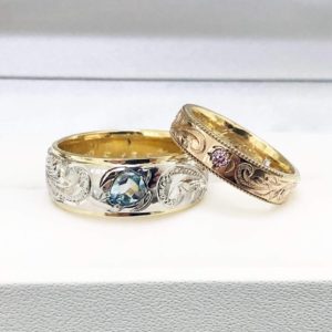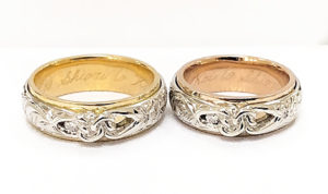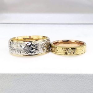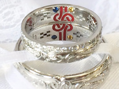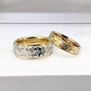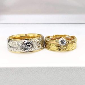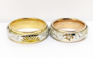 例えば、沖縄の伝統文化である紅型などによく見る波型をハワイアンジュエリーの技術で刻み込んだり、沖縄ではティーダと呼ばれている太陽(男性の神)のモチーフや月(女性の神)のモチーフ、沖縄のミンサー織りのミンサー柄やむすび柄などと、ハワイの伝統であるハワイアンジュエリーを融合することで、よりお二人の想いに合ったデザインを刻み込んだ結婚指輪をおつくりいたします。沖縄も好きだしハワイアンジュエリーも好きだし、どの意味も全部込めたい。そんなあなたの想いがすべて叶う結婚指輪がつくれるとしたら。あなたの希望をすべて叶えることができますよね。