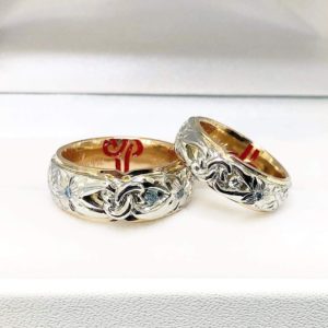 これが「世界にたったひとつの結婚指輪」と言える理由です。また多くの方が、フルオーダーでおつくりいただいております。ベースの形から、素材、彫りのデザイン、ミンサー柄やむすび柄の配置や彫り方まで、すべて自由です。全提案型ですので、オーダーしてみたいけど、難しそう。とか、そこまでこだわりが無いかも…という方でも全然安心しておつくりいただけます。
